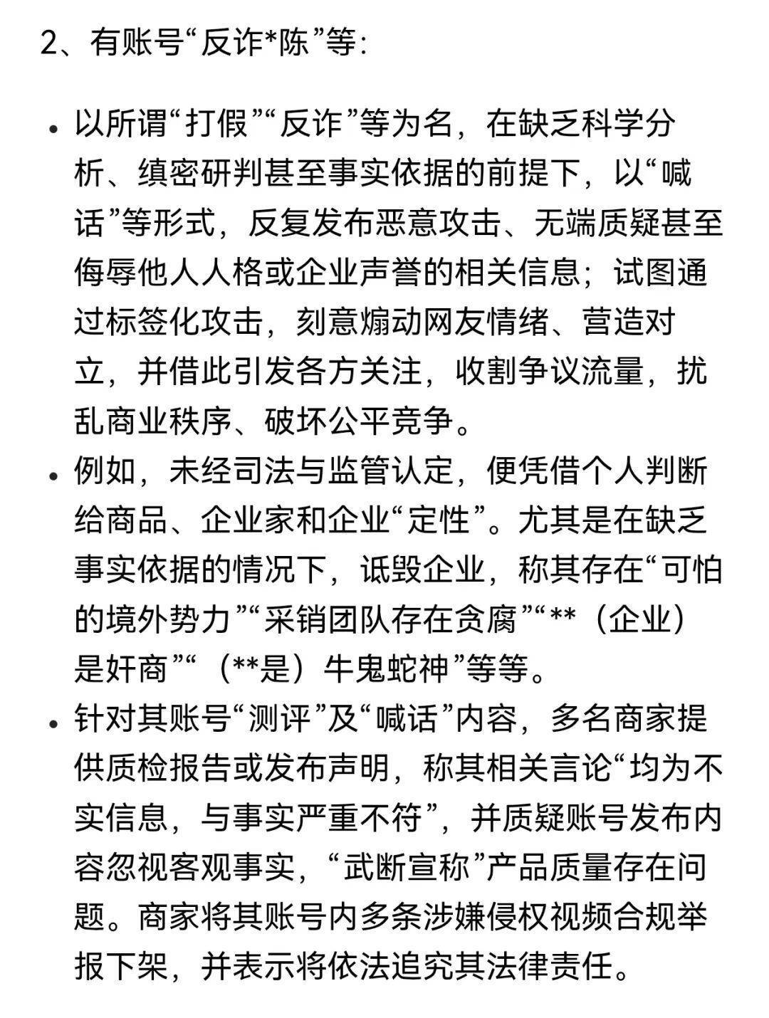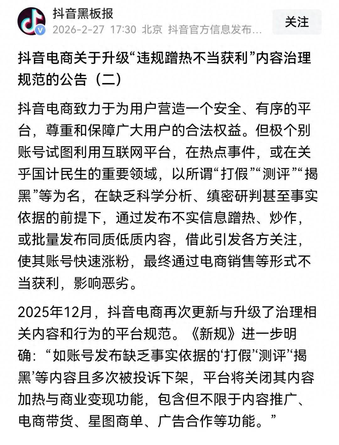 2月27日,抖音黑板报发布通告称,平台在专项巡查中发现,有“反诈*陈”等账号以所谓“打假”“反诈”等为名,在缺乏事实依据的前提下,以“喊话”等形式反复发布恶意攻击、无端质疑,甚至发布侮辱他人人格或企业声誉的相关信息,试图通过标签化攻击刻意煽动网友情绪、营造对立。